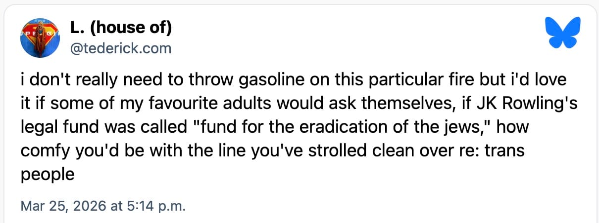 For people like me, all of this is going to be painful, repeatedly so, because around every corner is going to be another person who blithely walked over the line and doesn’t give a fuck — who either thinks me and mine are a community worth targeting, or at best a community not worth protecting. I was out doing my thing on Saturday when I found out a writer and podcaster I quite like, Andy Greenwald — a guy who, ethically and critically and creatively, seemed (at a distance) up till now largely aligned with me, as regards pretty much everything that’s happening in Hollywood, in the States, and in life — has been working on the Harry Potter show this whole time. A guy who thinks ICE is terrible and The Lowdown rules, also saw an open attack on transgender people and said “that, that I will help fund.”